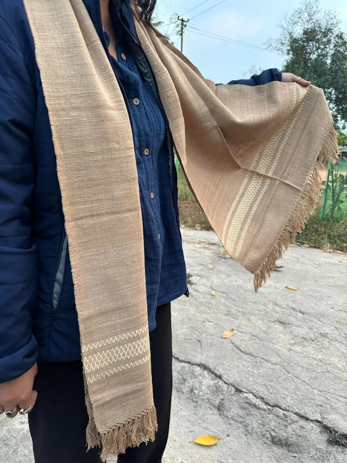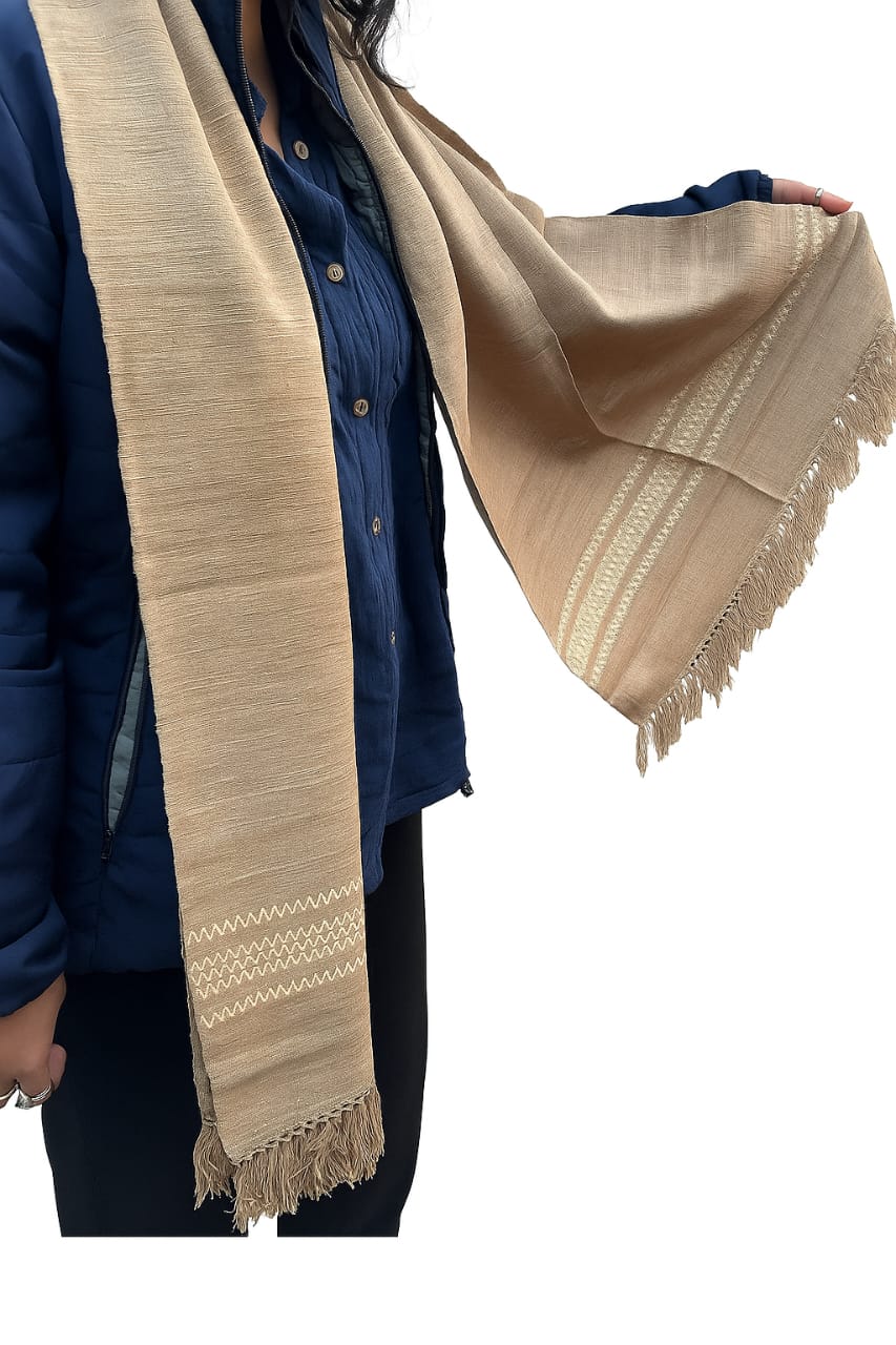Certainly! The Eri Silk Stole in light brown with a golden border design is a beautifully handcrafted accessory made from Eri silk, also known as “Ahimsa silk” due to its ethical and sustainable production process. This stole is known for its soft texture, durability, and eco-friendly nature.