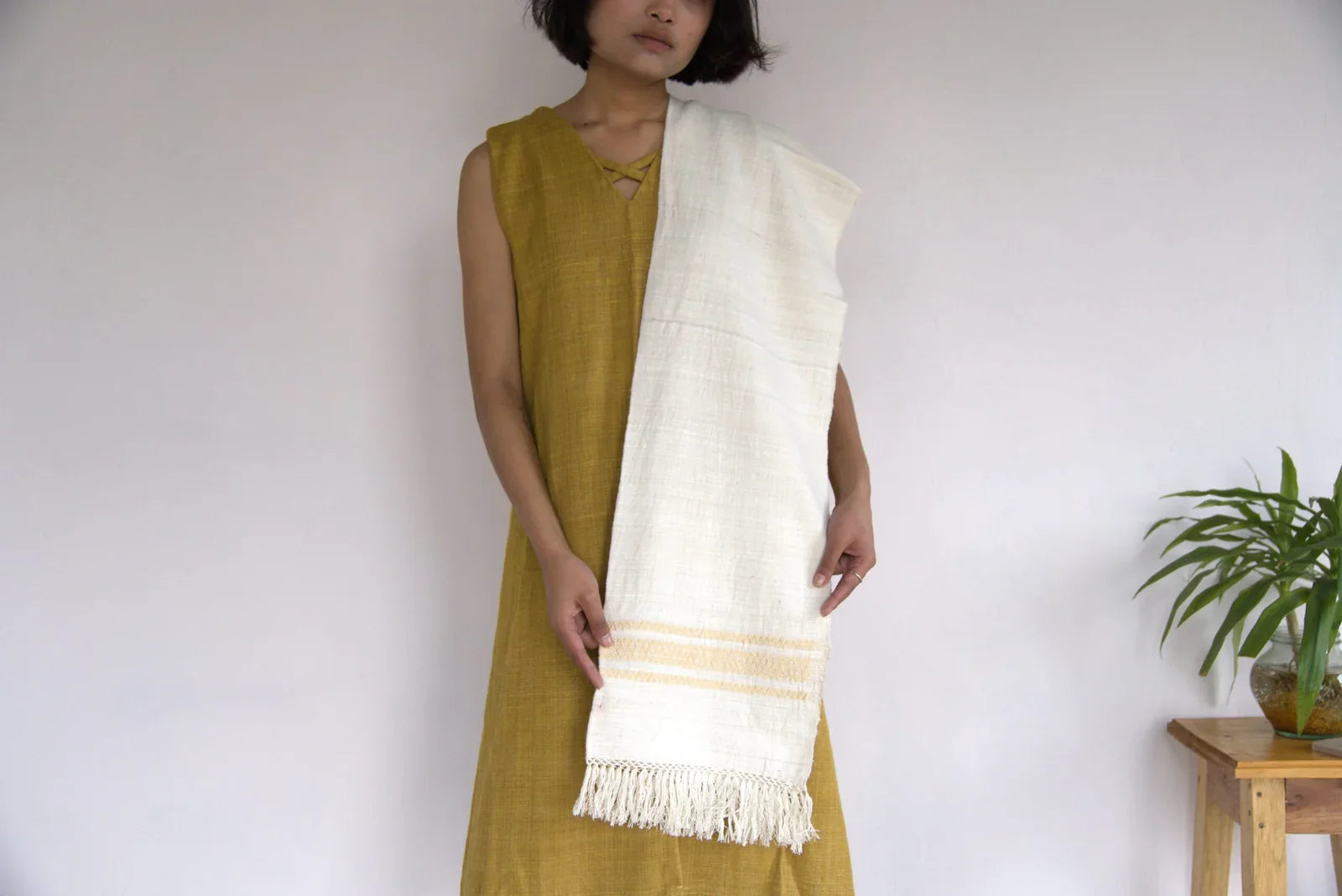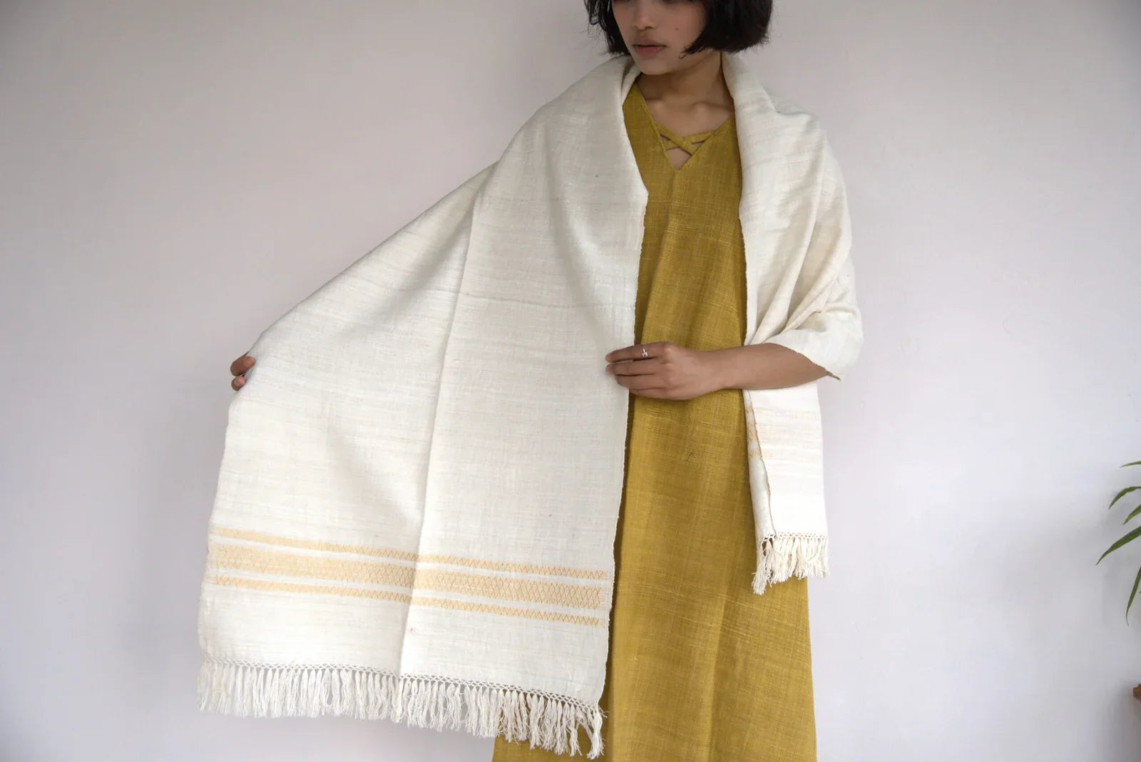 An Eri silk stole in off-white with a golden border is a luxurious and elegant accessory. Eri silk, also known as Ahimsa silk, is prized for its soft texture and durability. This stole is lightweight yet warm, making it perfect for both casual and formal wear.